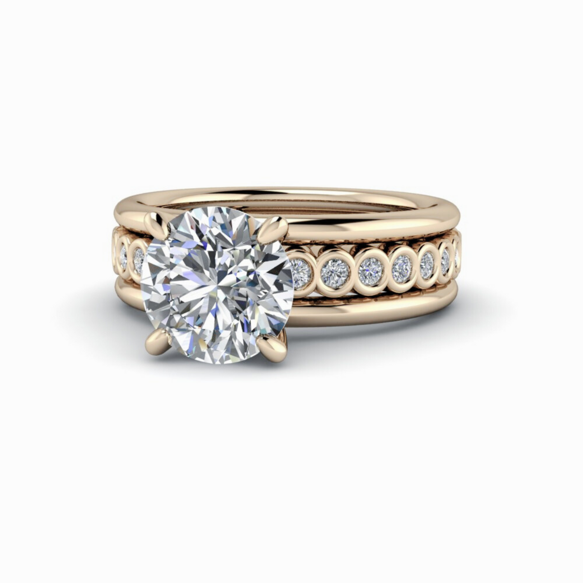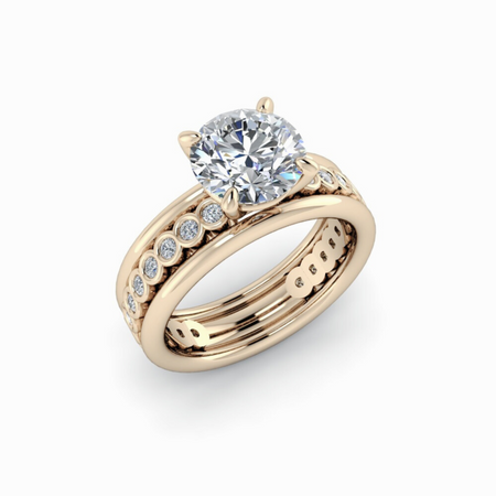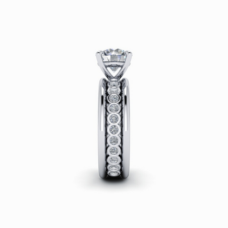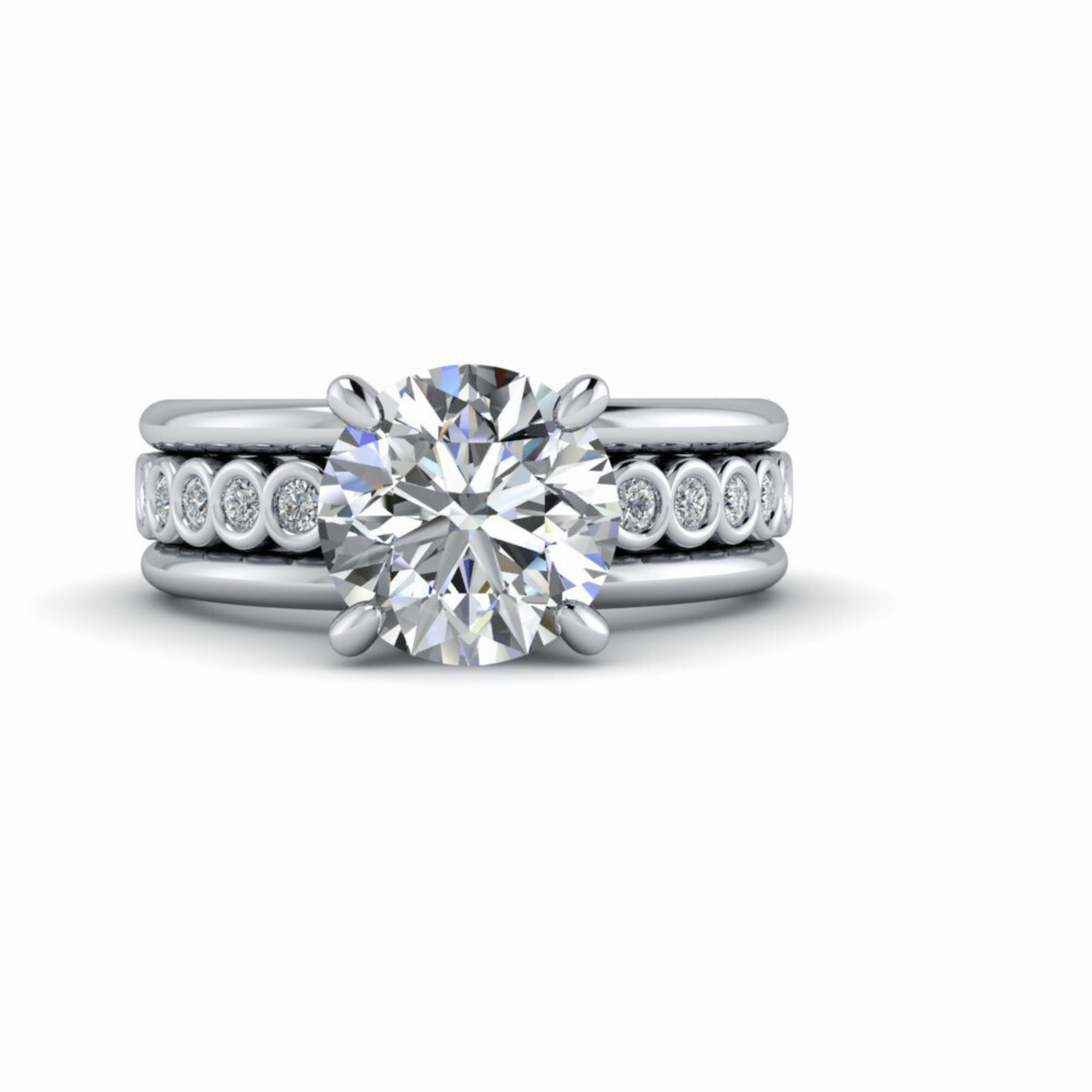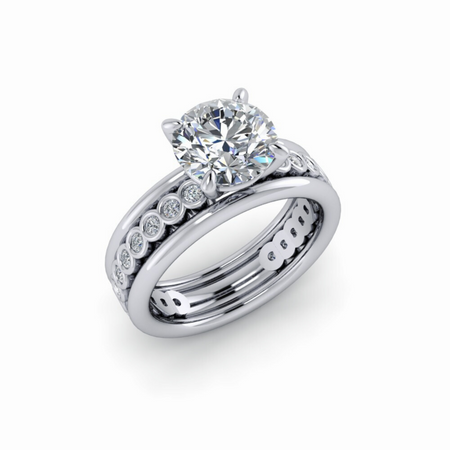 Setting: Bezel set round lab grown diamonds, .30 ct. F Color, VS Clarity.