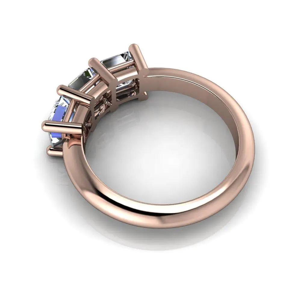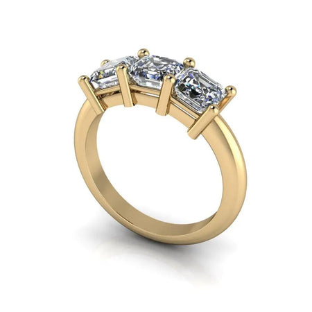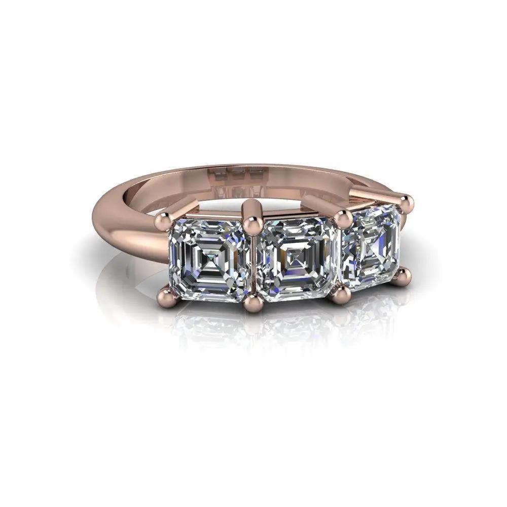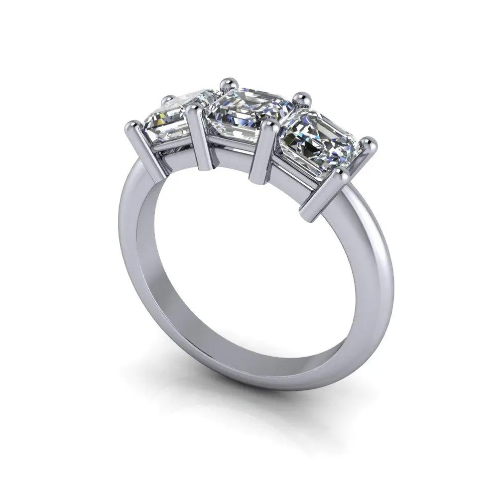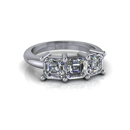 Moissanite anniversary ring shown with (3) 5mm asscher cut colorless moissanite, DEF Color, VVS Clarity.
