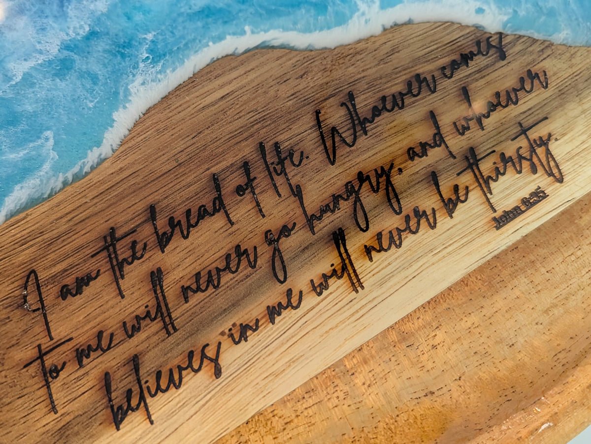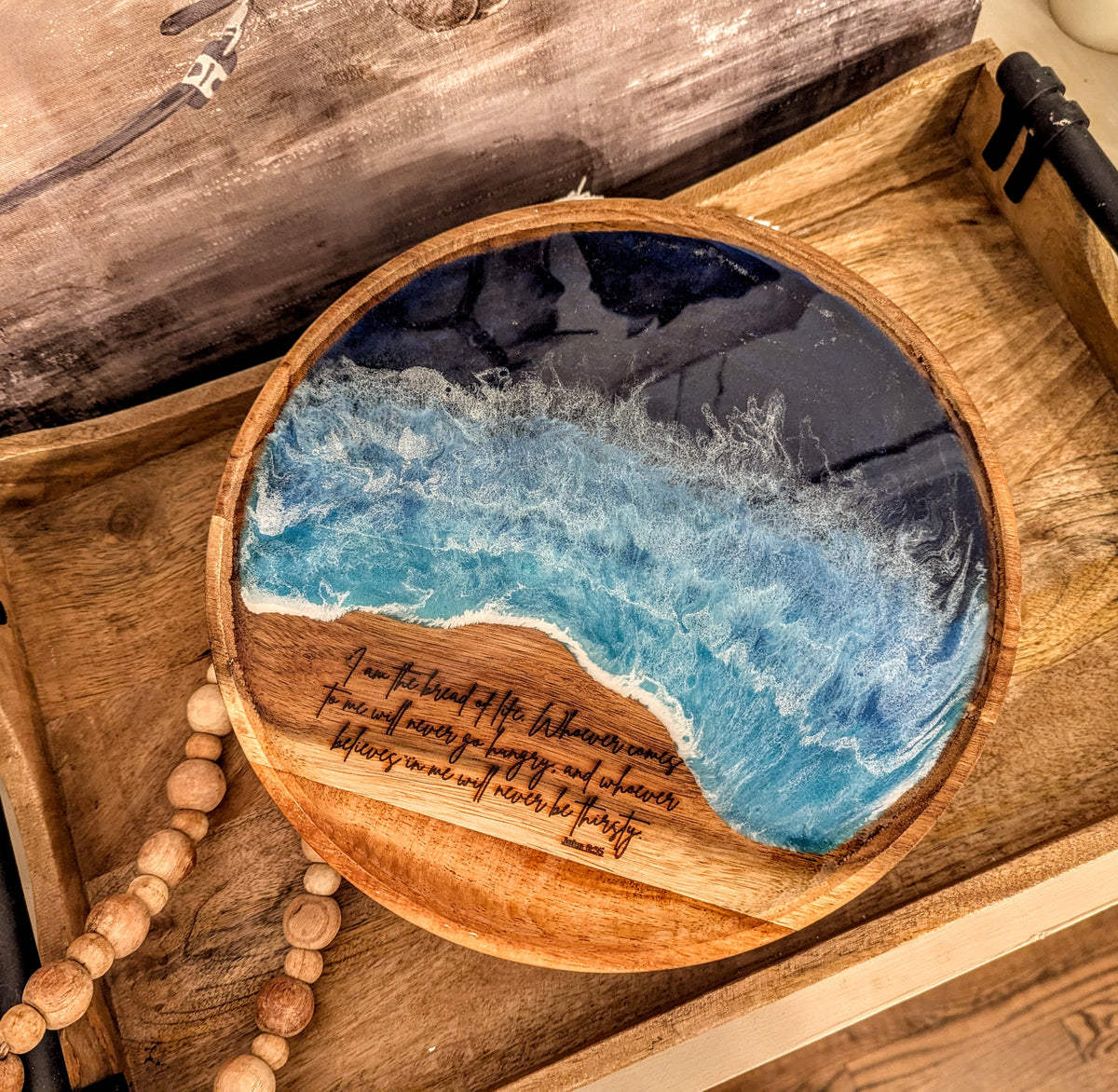 One of a Kind hand poured to create the perfect ocean wave design, our Wood Tray combines style and function. The perfect accessory for entertaining.