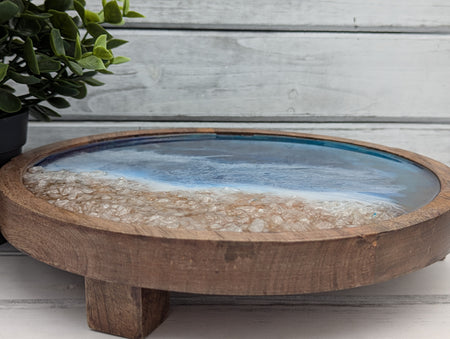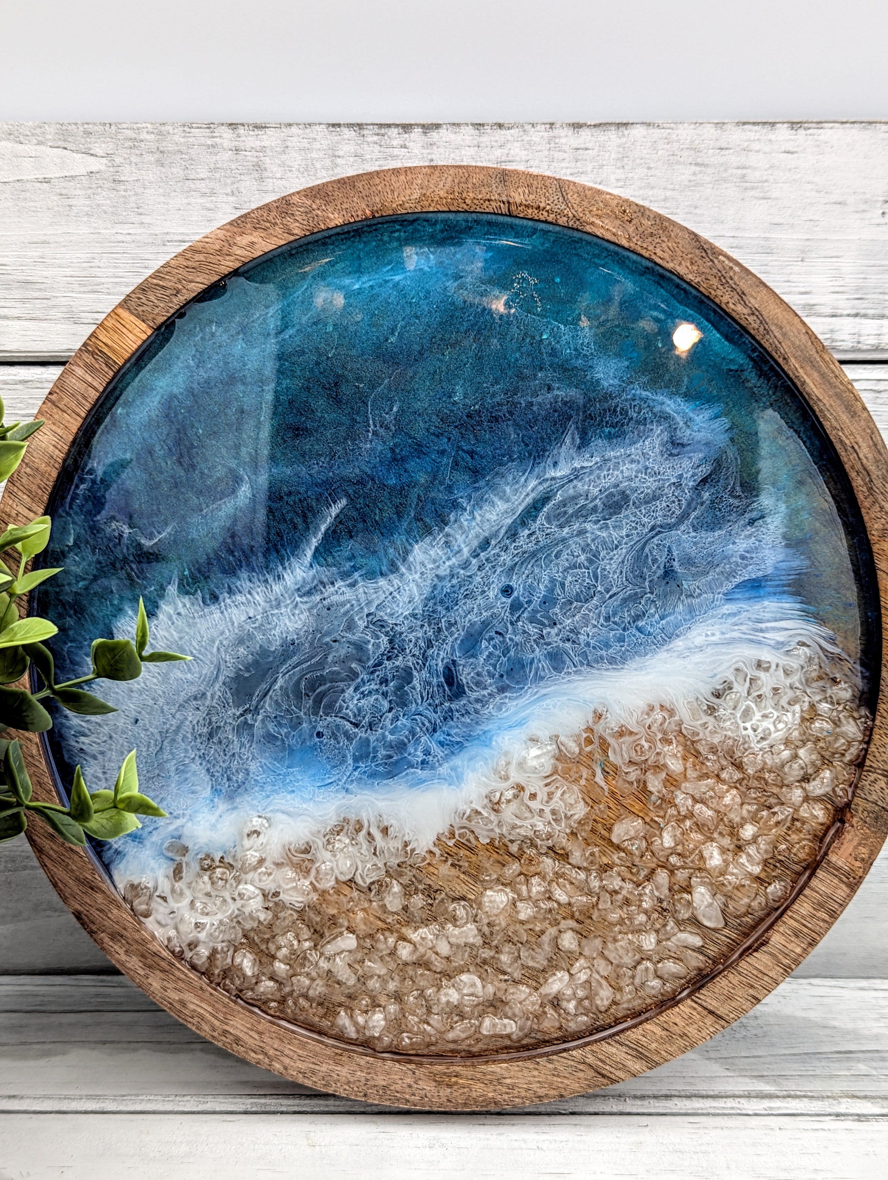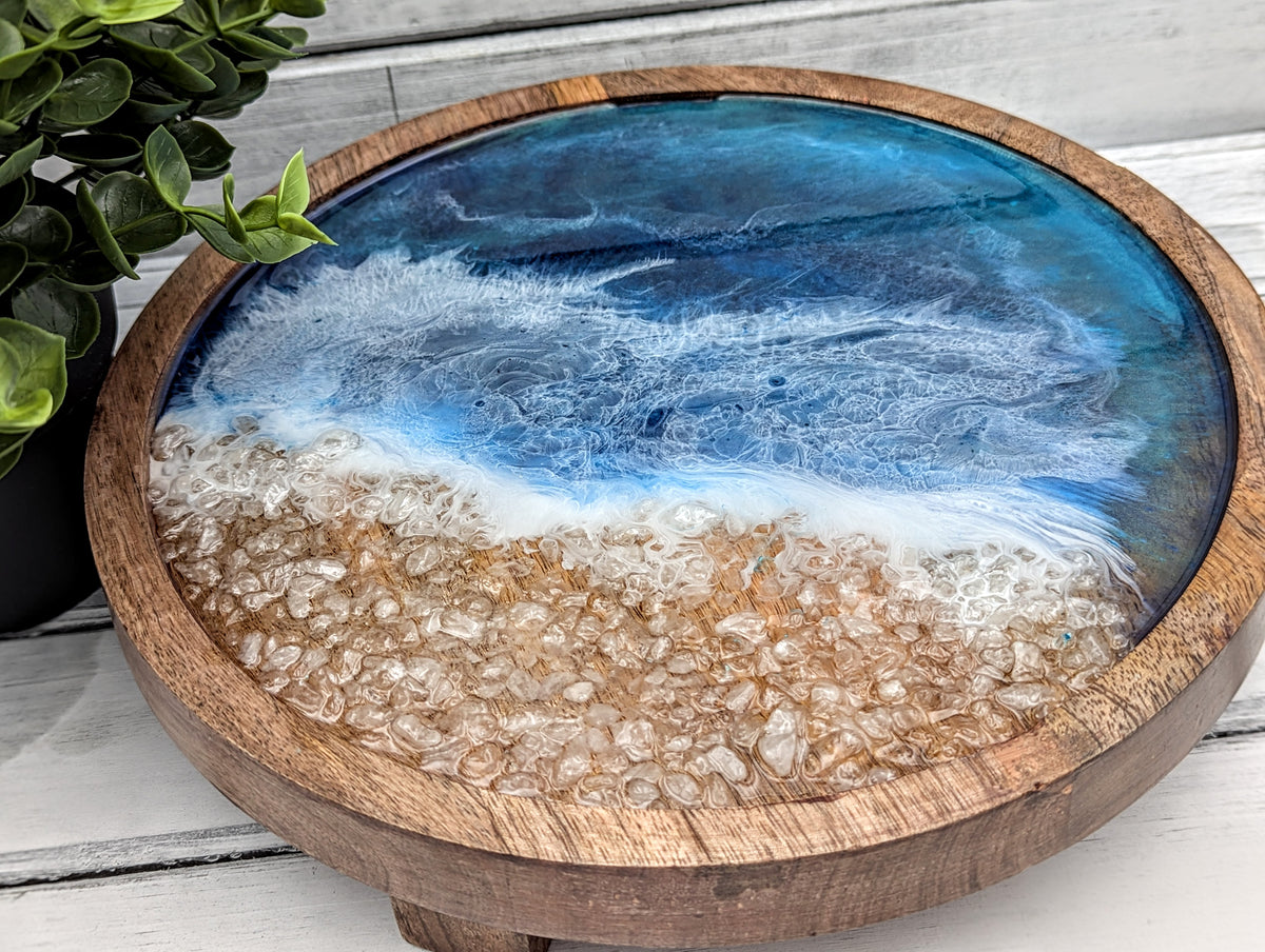 One of a Kind round wood tray with hand poured epoxy to create the perfect ocean wave design. Our Wood Tray can be used as kitchen decor, bathroom decor, or in your beach home.