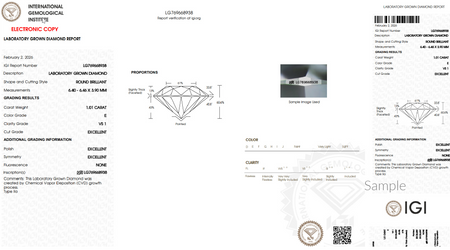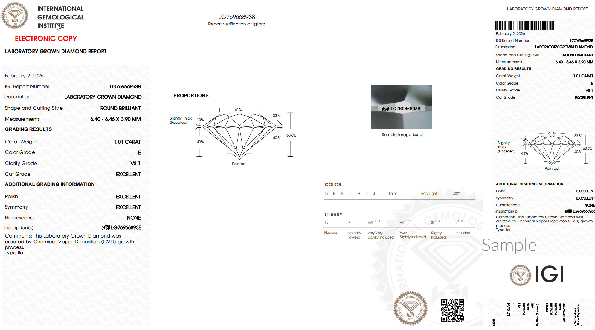 The ring is set with (3) 1.00 ct. IGI Certified Round lab grown diamonds, E Color, VS1 Clarity.