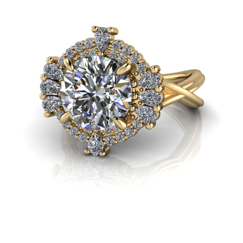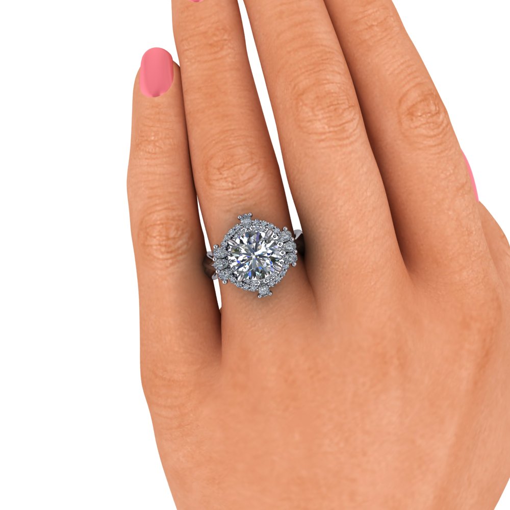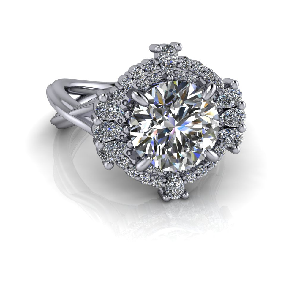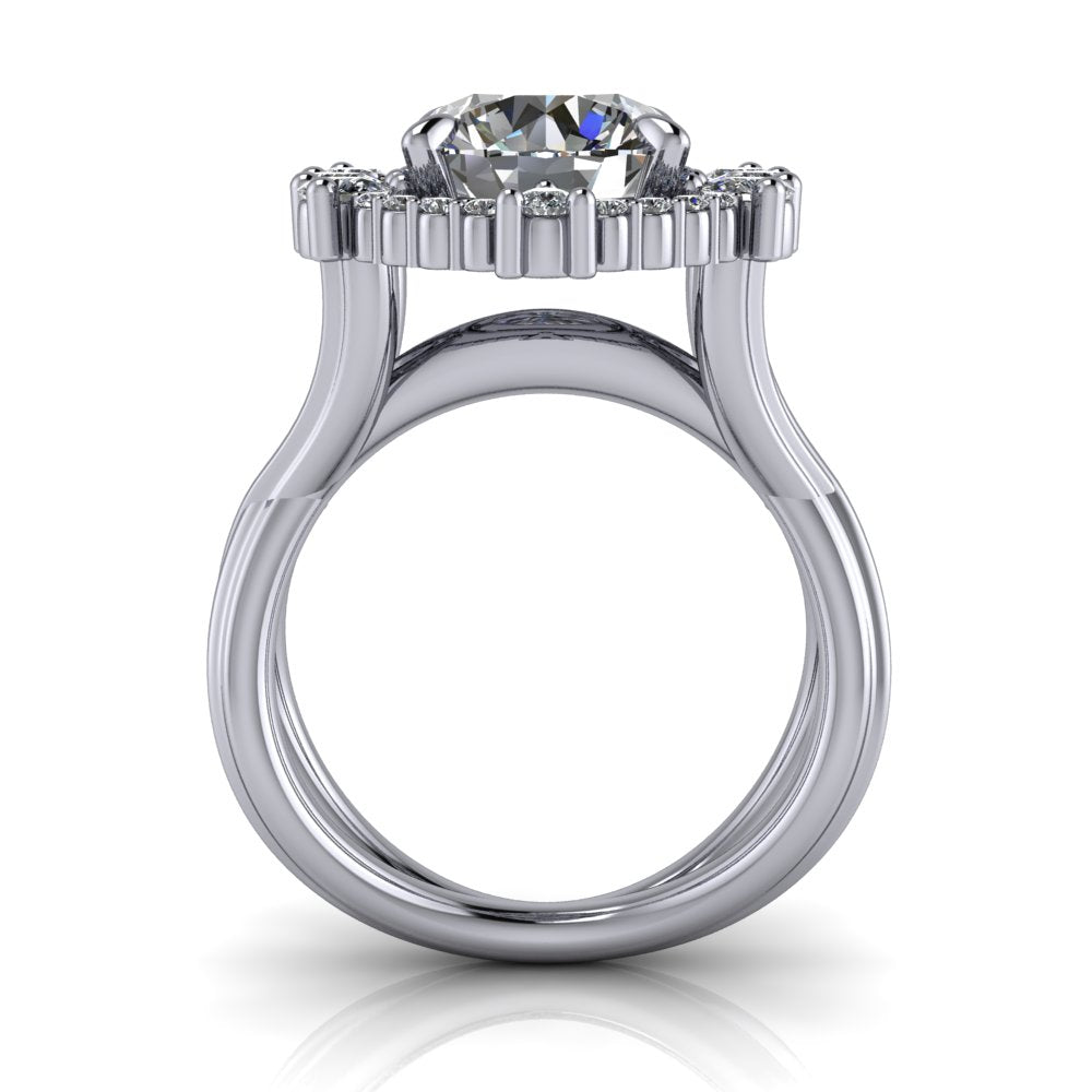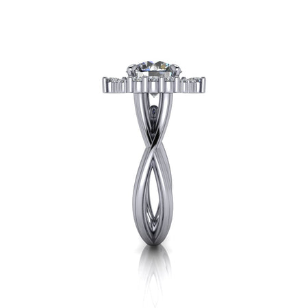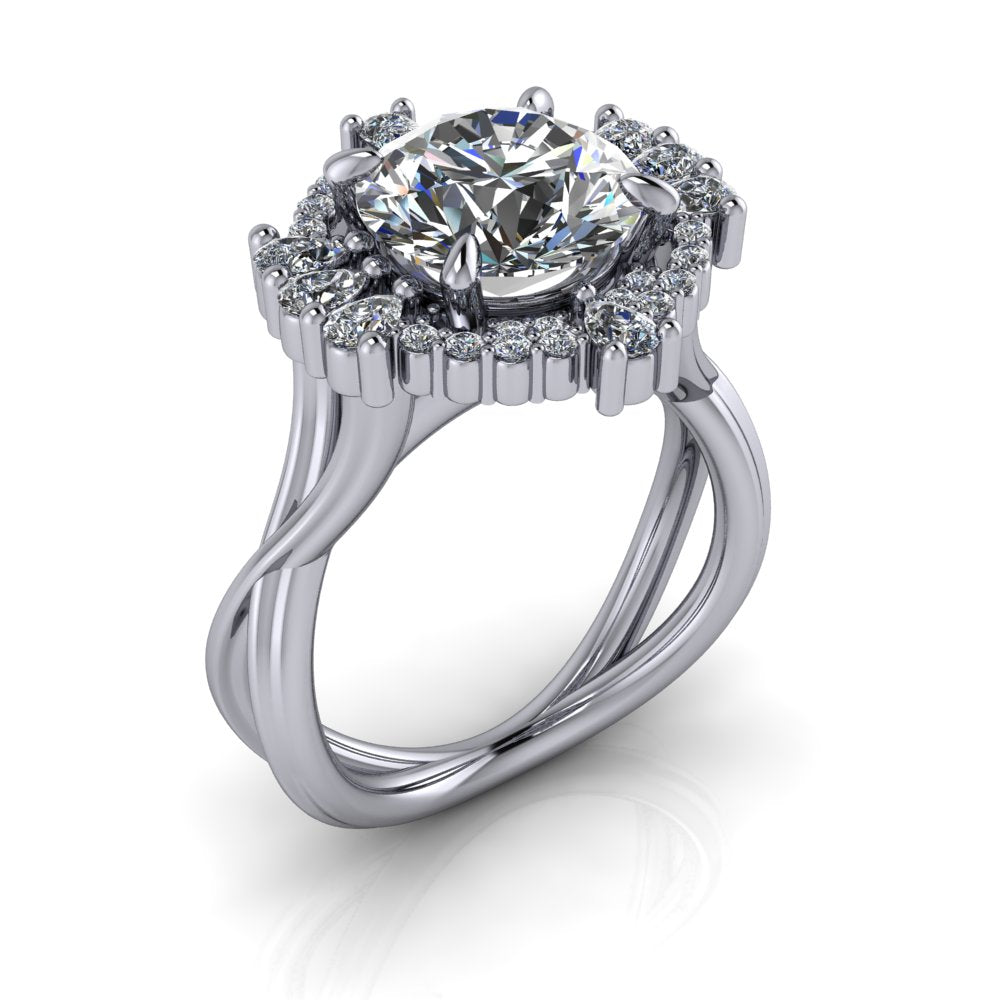 Round lab diamond spit shank engagement ring offered in gold or platinum.