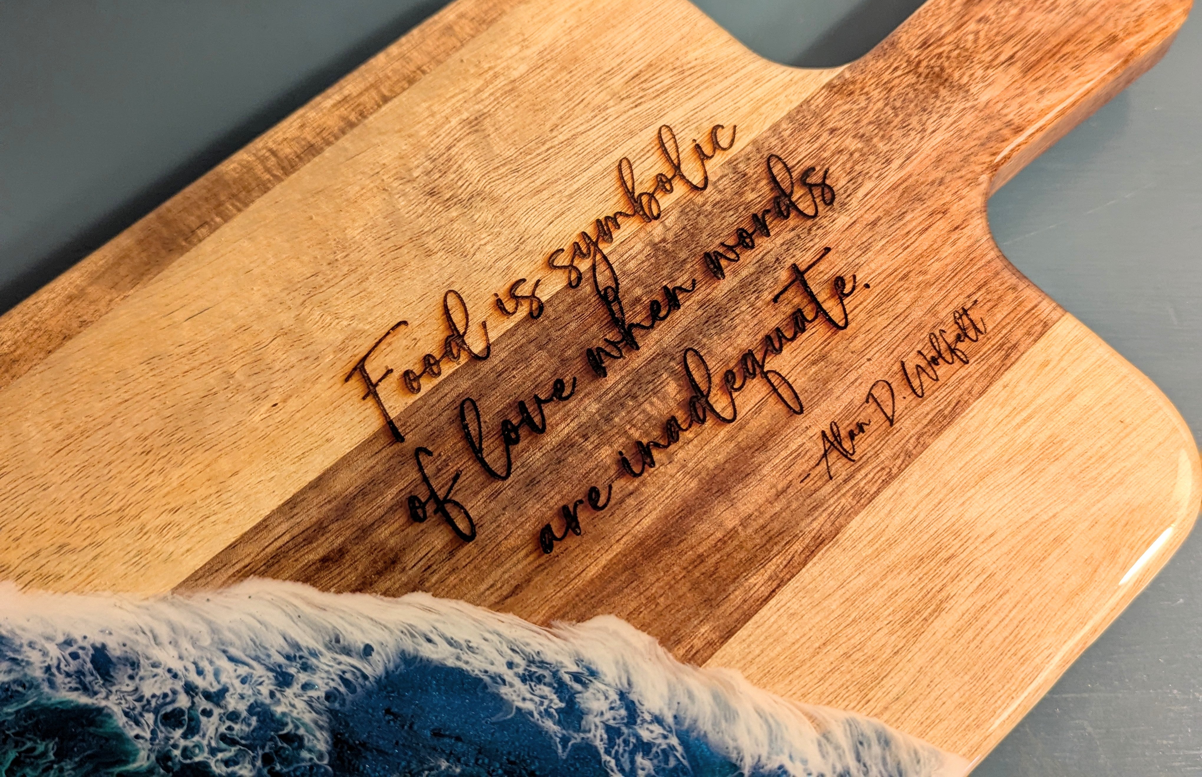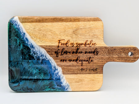 The perfect hostess gift or for the chef in your house! Handcrafted Wood Charcuterie Board for snacks. Â Engraved with a Quote, "Food is Symbolic of Love when Words are Inadequate."