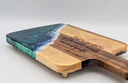 Natural Wood. Hand poured epoxy ocean waves. Board has full coverage resin and wrapped sides for longevity.