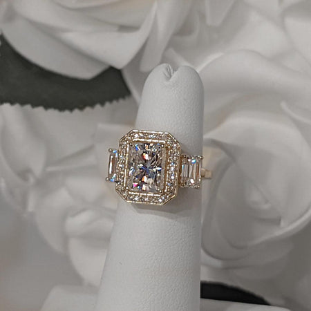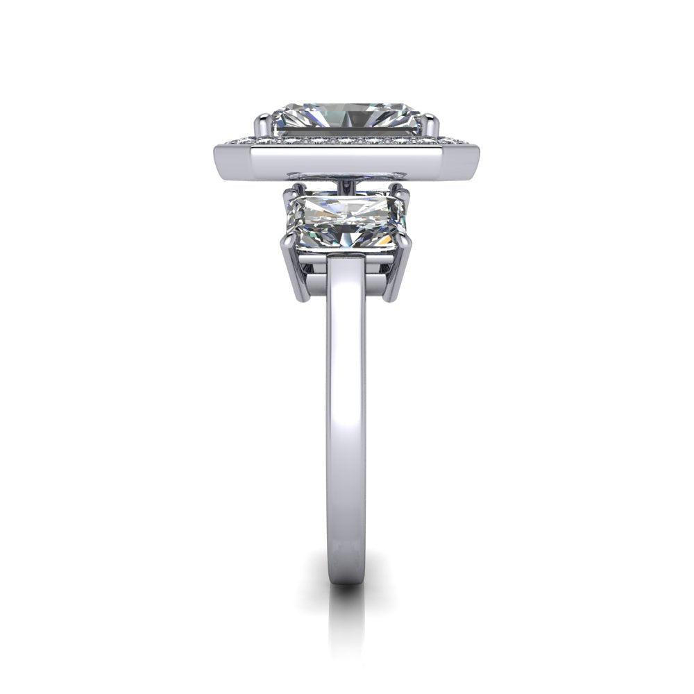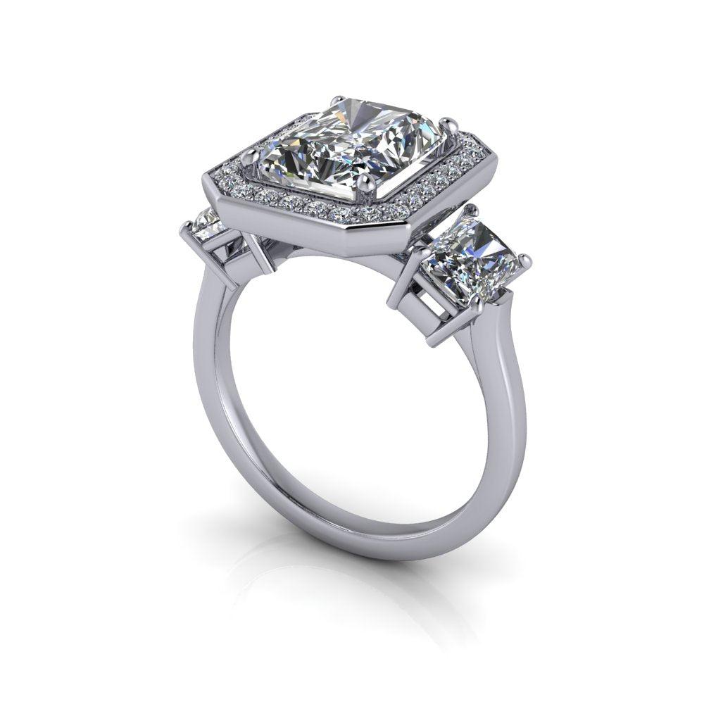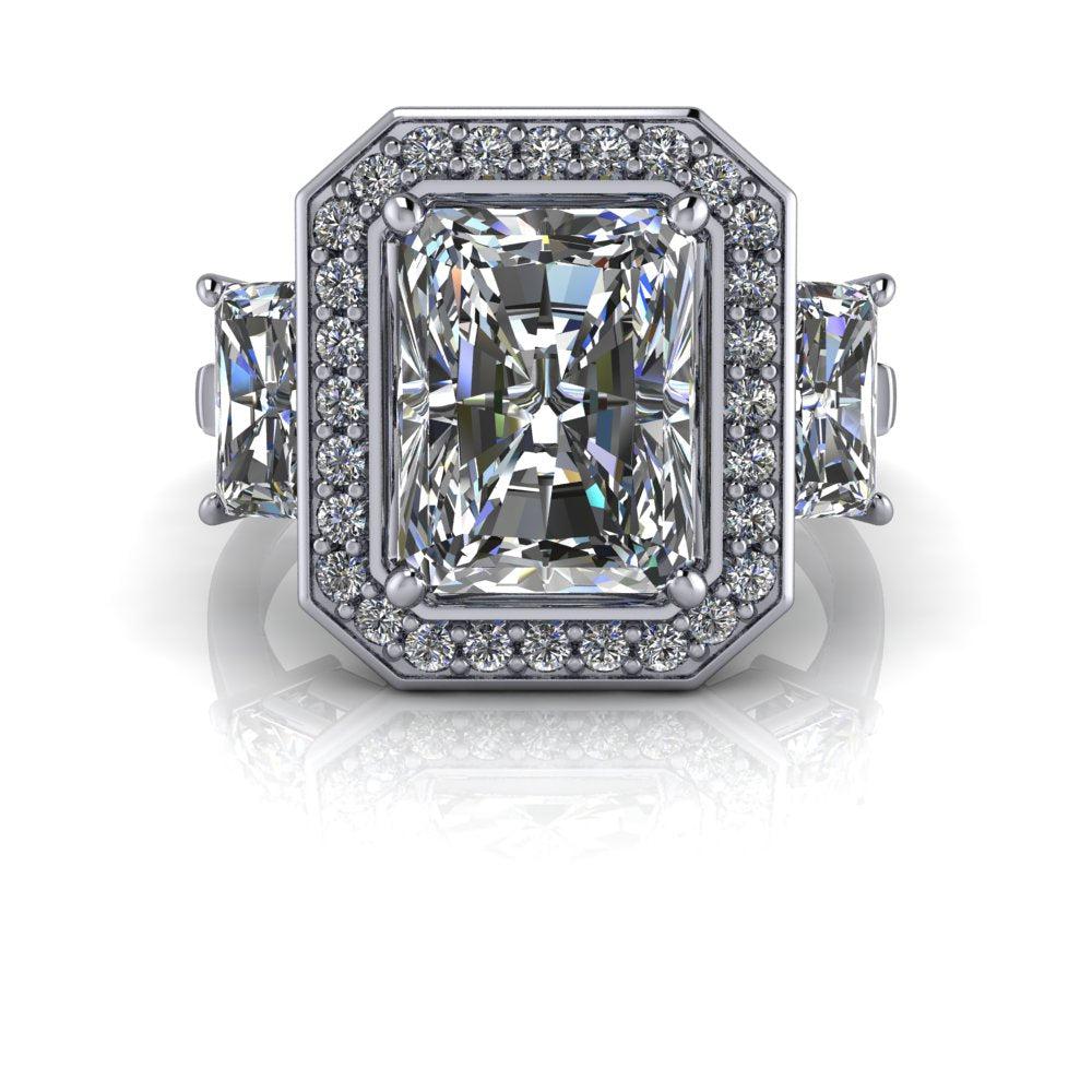 The moissanite engagement ring is shown with a 9x7mm, 2.70 ct radiant cut colorless moissanite, DEF Color, VVS Clarity, (2) 6x4mm, .70 ct radiant cut colorless moissanite, DEF Color, VVS Clarity, and 1.20mm round colorless moissanite, .20 ct.