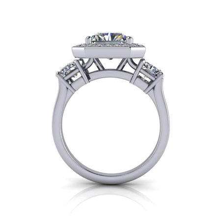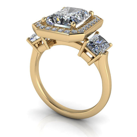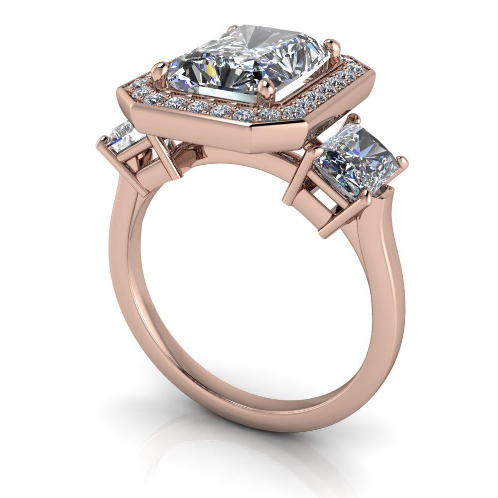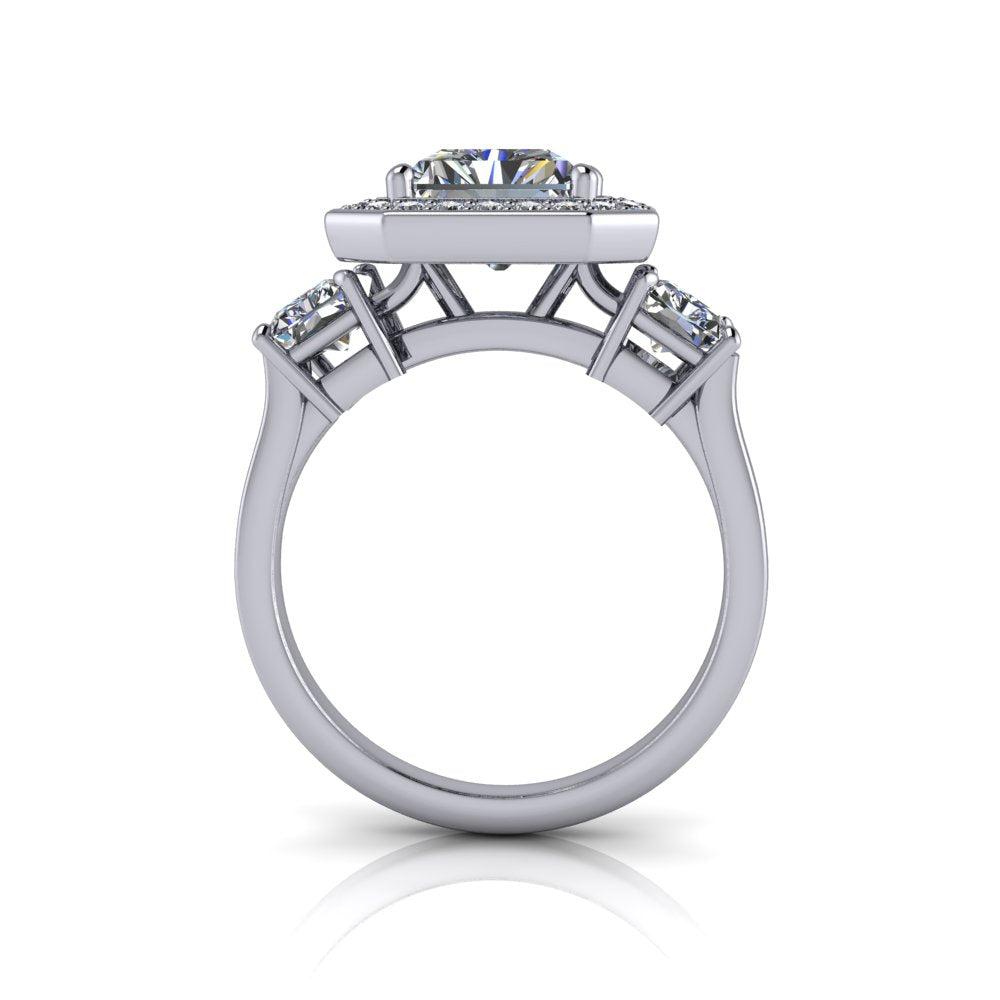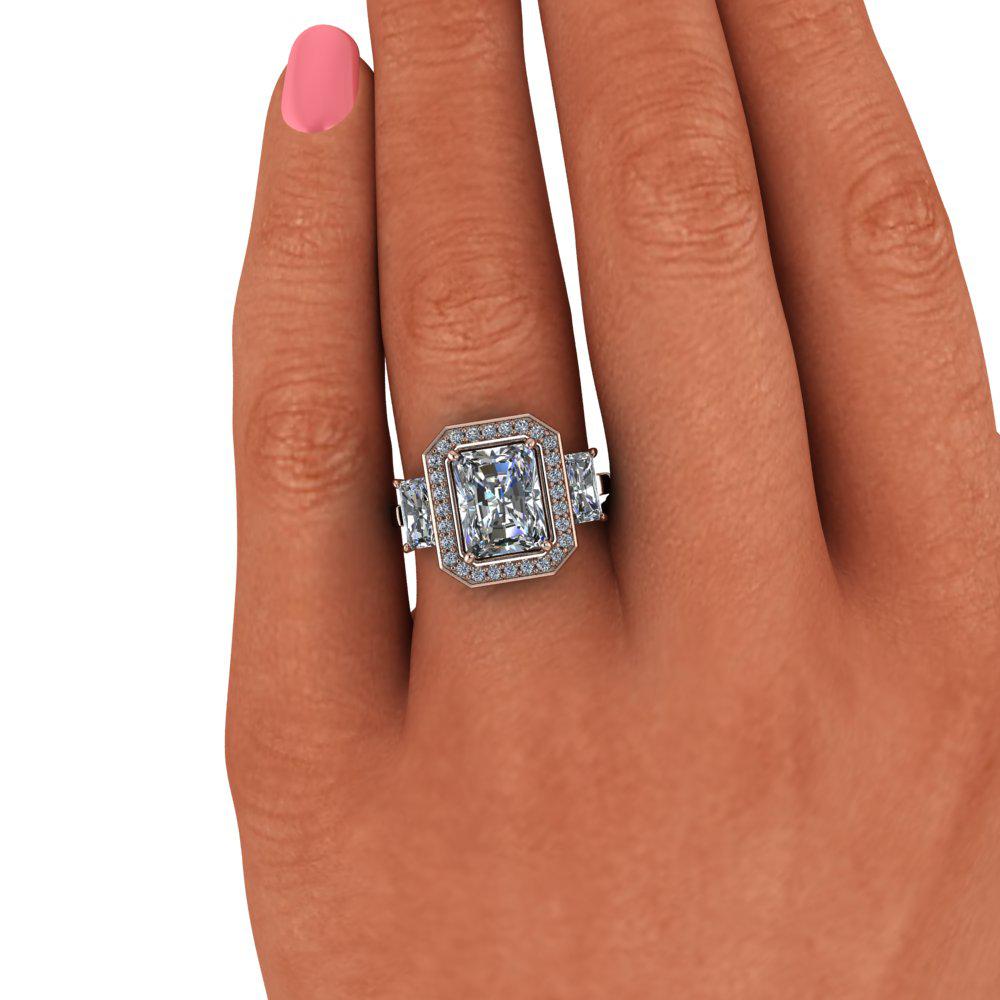 The moissanite engagement ring is shown with a 9x7mm, 2.70 ct radiant cut colorless moissanite, DEF Color, VVS Clarity, (2) 6x4mm, .70 ct radiant cut colorless moissanite, DEF Color, VVS Clarity, and 1.20mm round colorless moissanite, .20 ct.