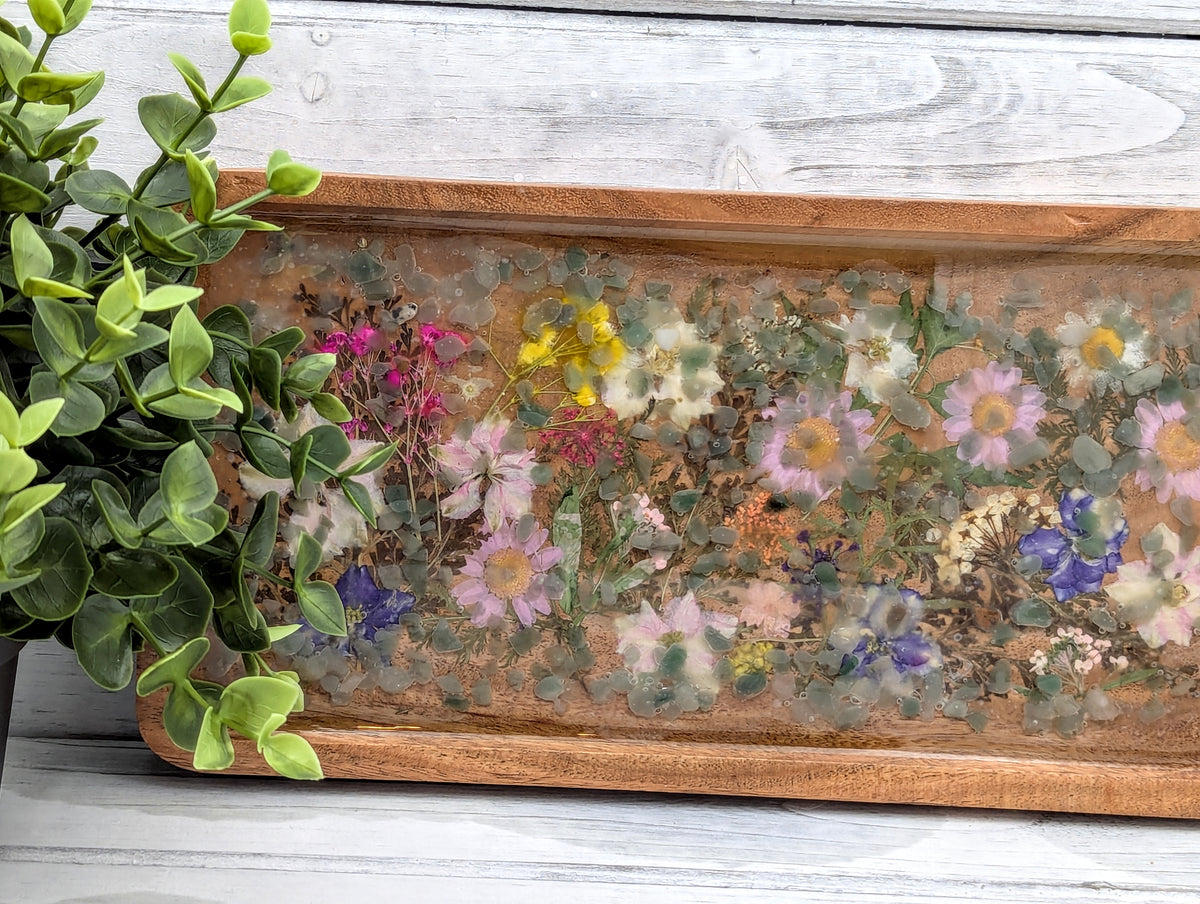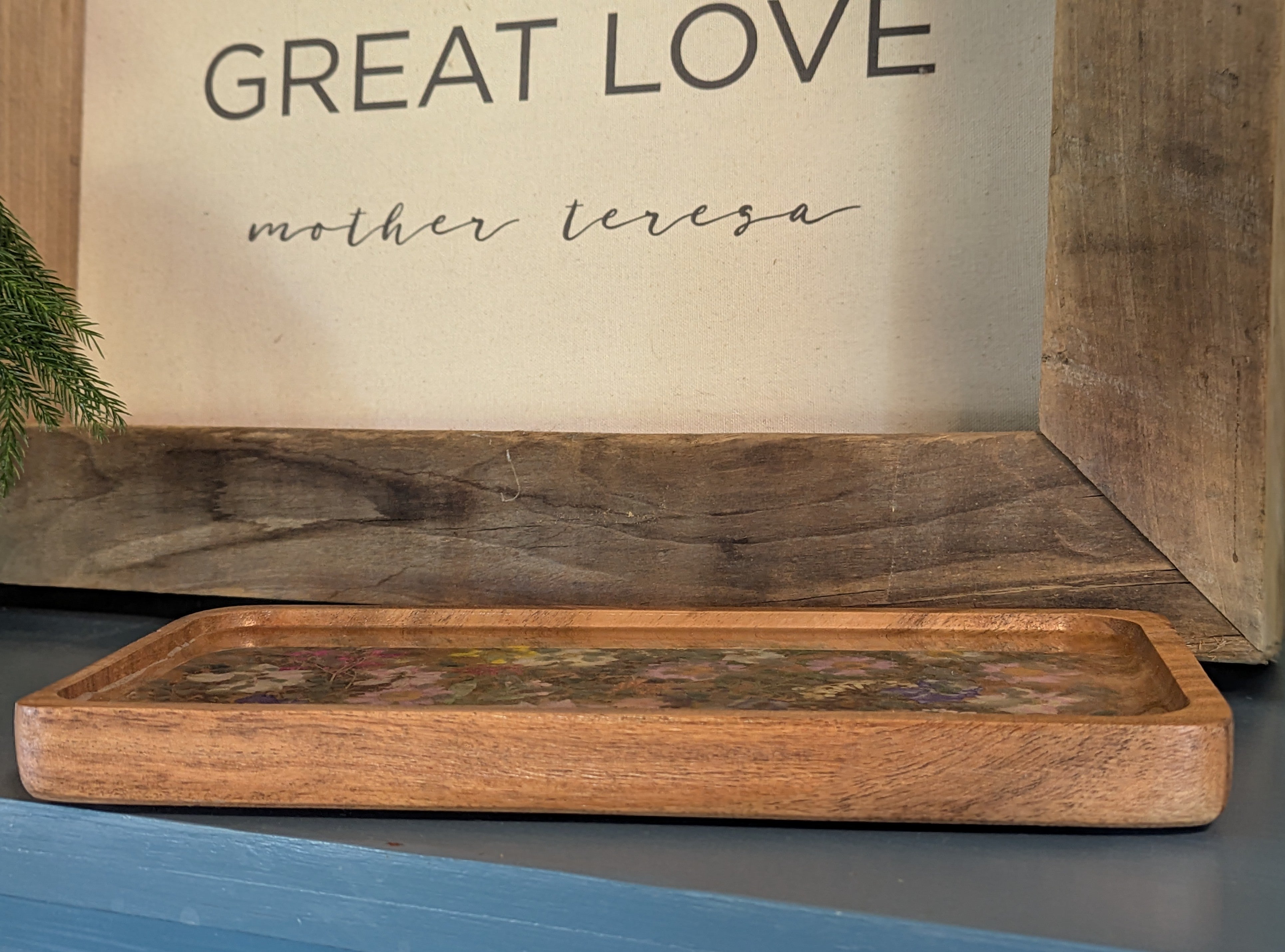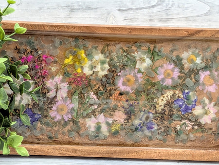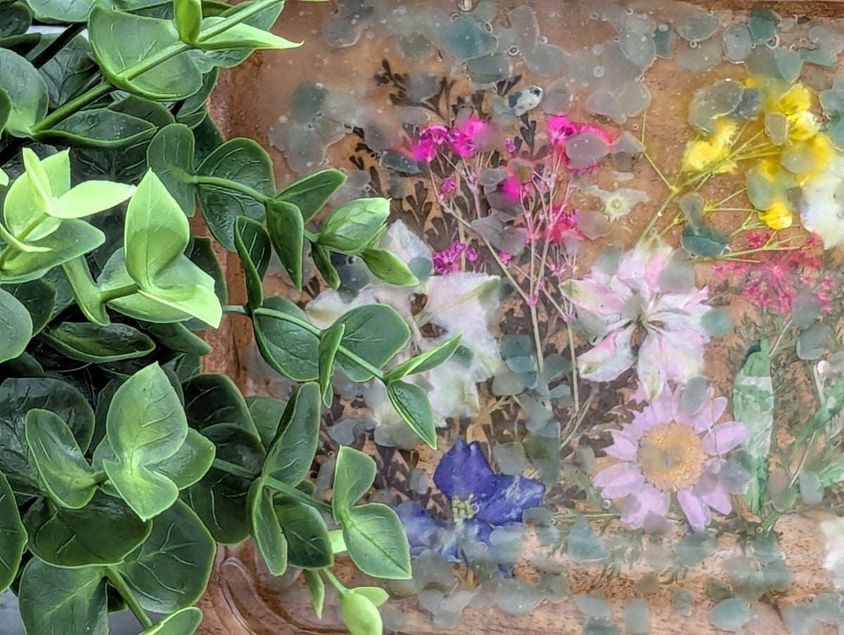 Natural Wood, preserved flowers and sea glass. 12"x 6"