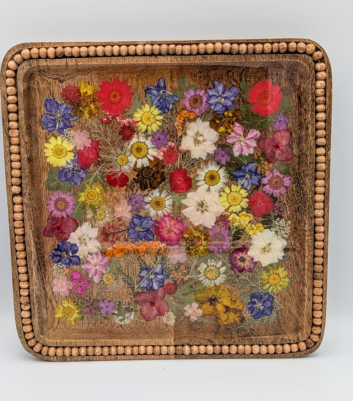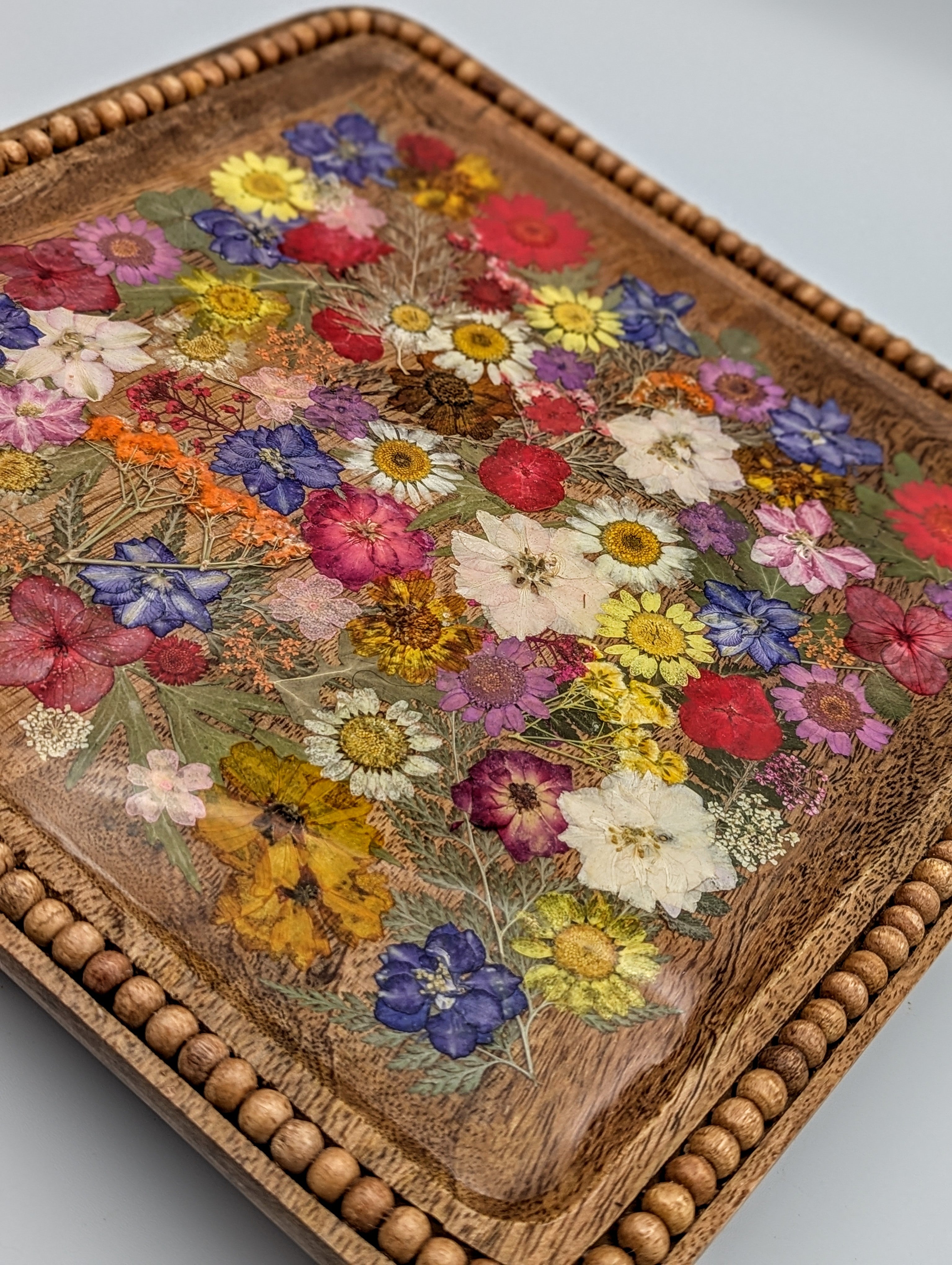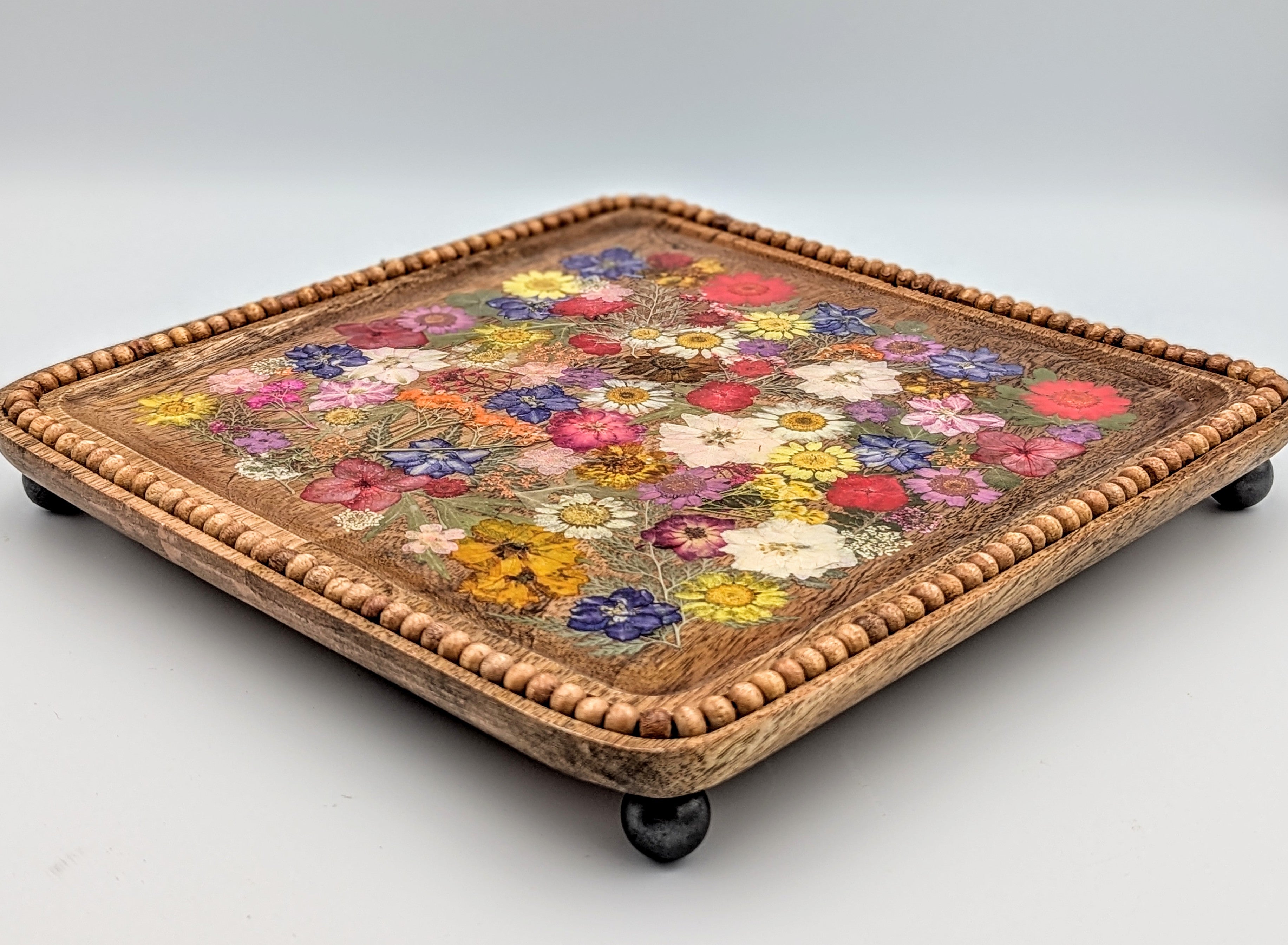 Perfect for entertaining or as a decorative piece, our handcrafted wood serving tray with sealed and preserved dried flowers would make a perfect gift for the new couple.