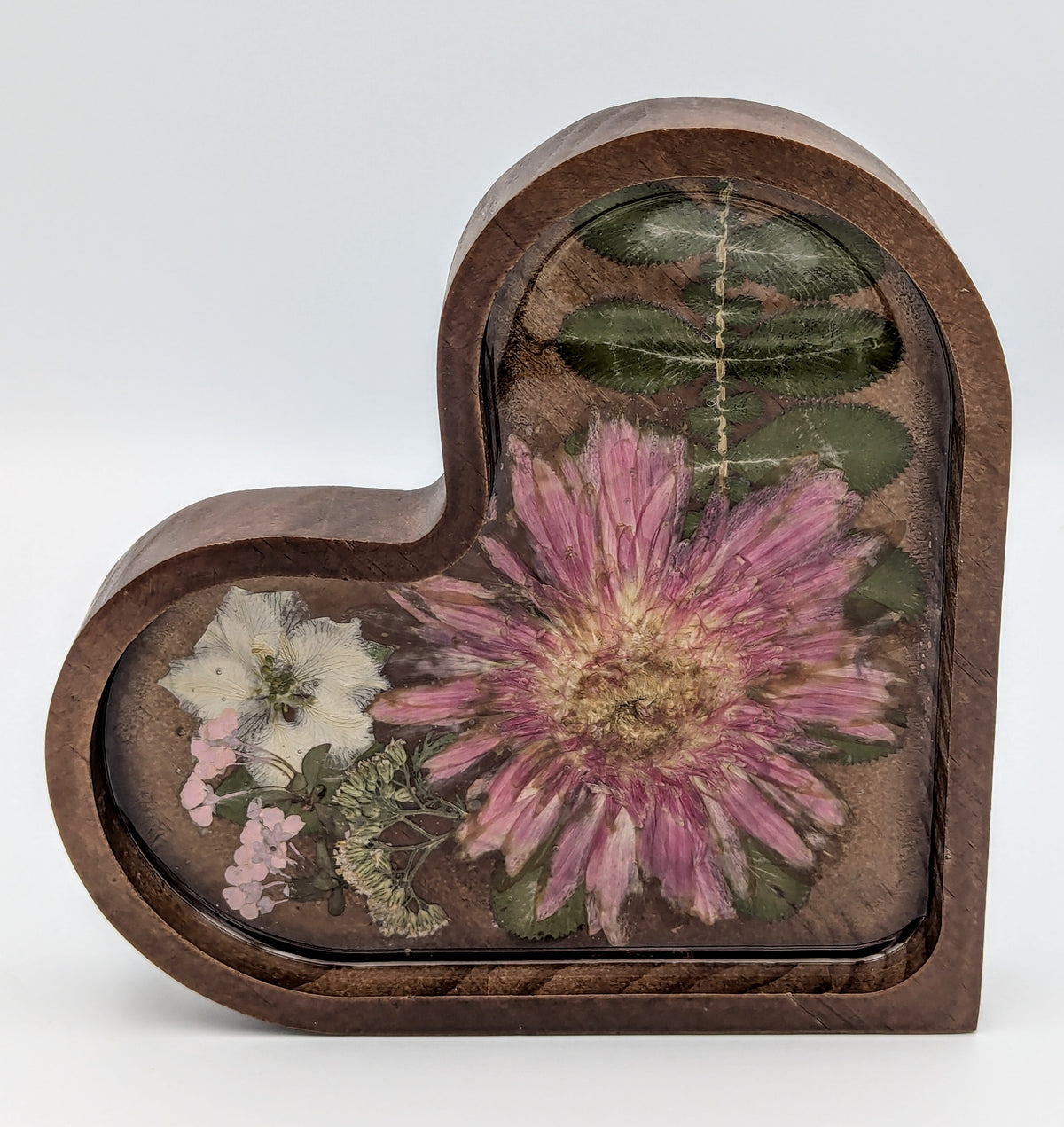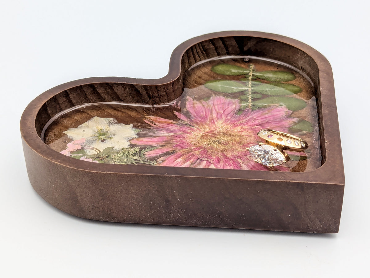 One-of-a-kind Wood Heart Jewelry Dish is engraved with the words " Forever Yours Endlessly. It is a perfect gift for your love. The delicate dried flowers add a charming touch, preserved forever under clear resin.